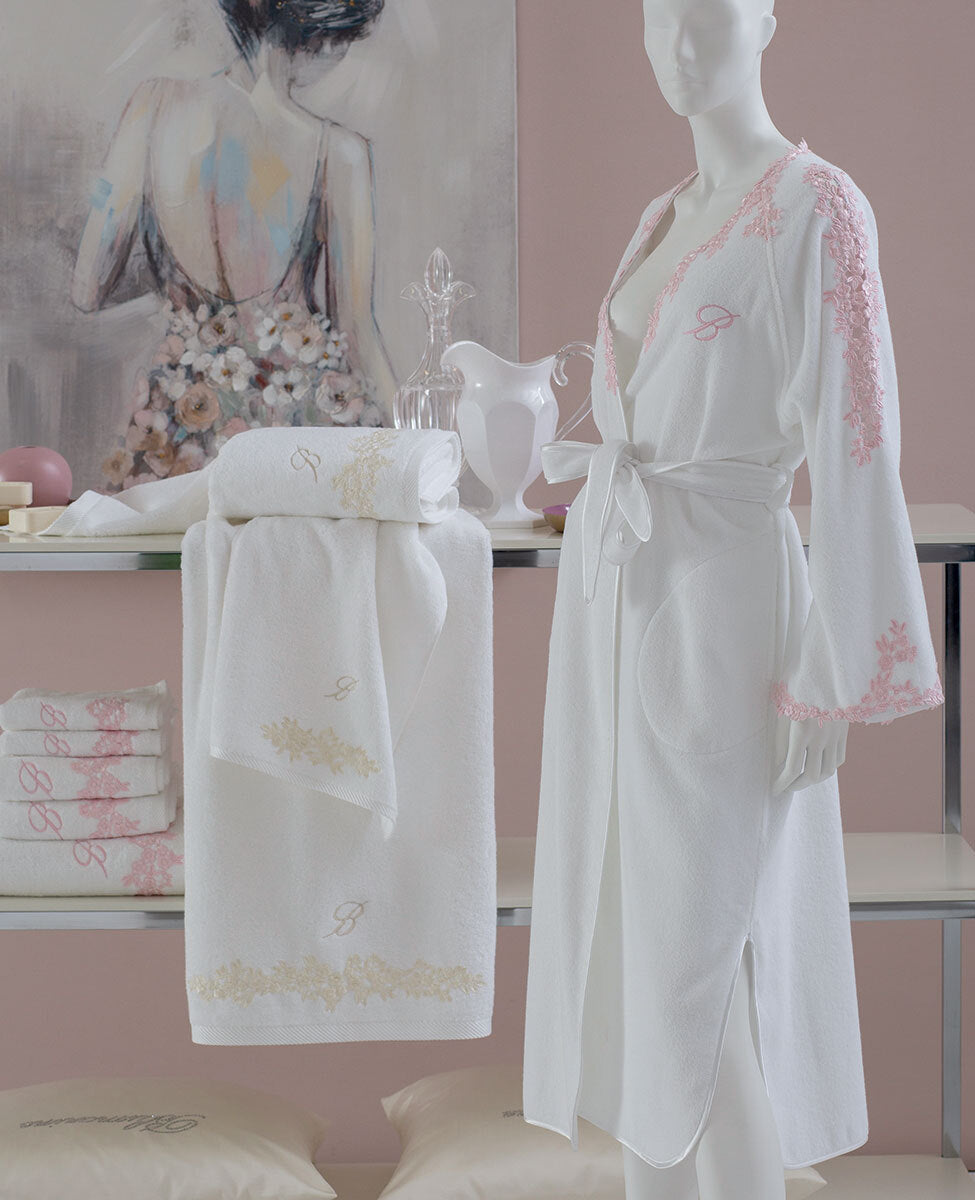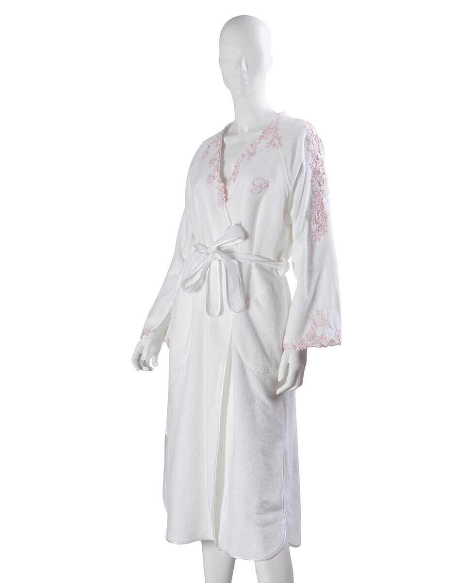 Accappatoio modello kimono tinta unita con inserti ad intaglio in macramè rimessi su scollo, spalle e giromanica, finitura con nastrino agli orli, logo Blumarine ricamato, taglia S/M.