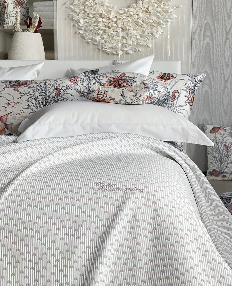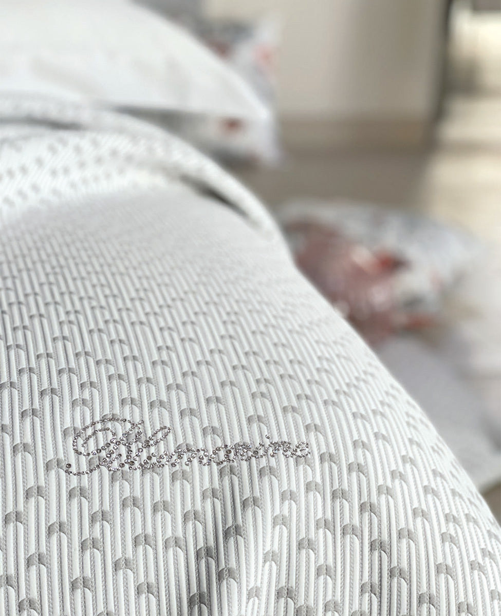 Copriletto matrimoniale liscio in piqué tinto in filo con logo in cristalli.