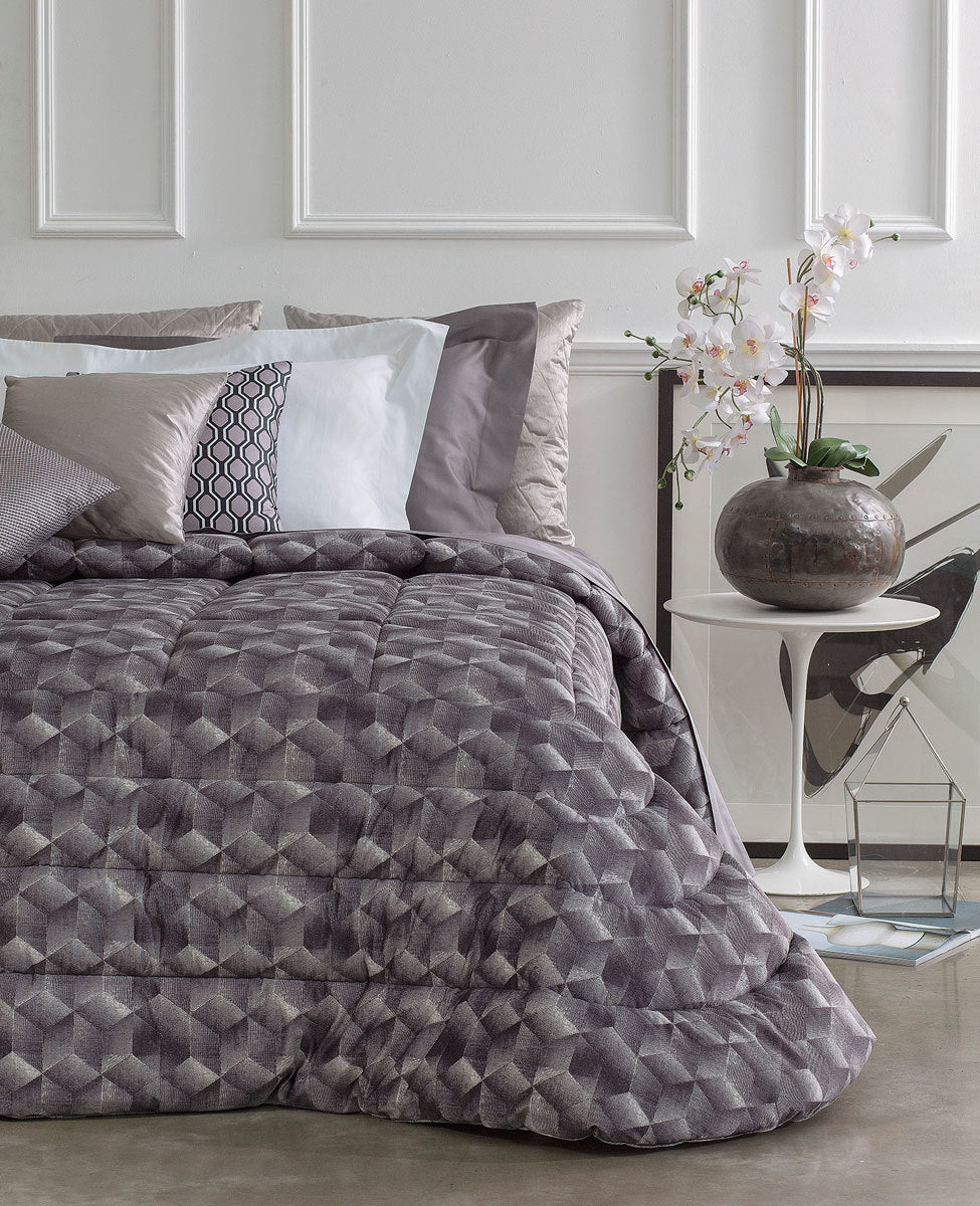 Calda e avvolgente trapunta matrimoniale in velluto stampato con tema geometrico.